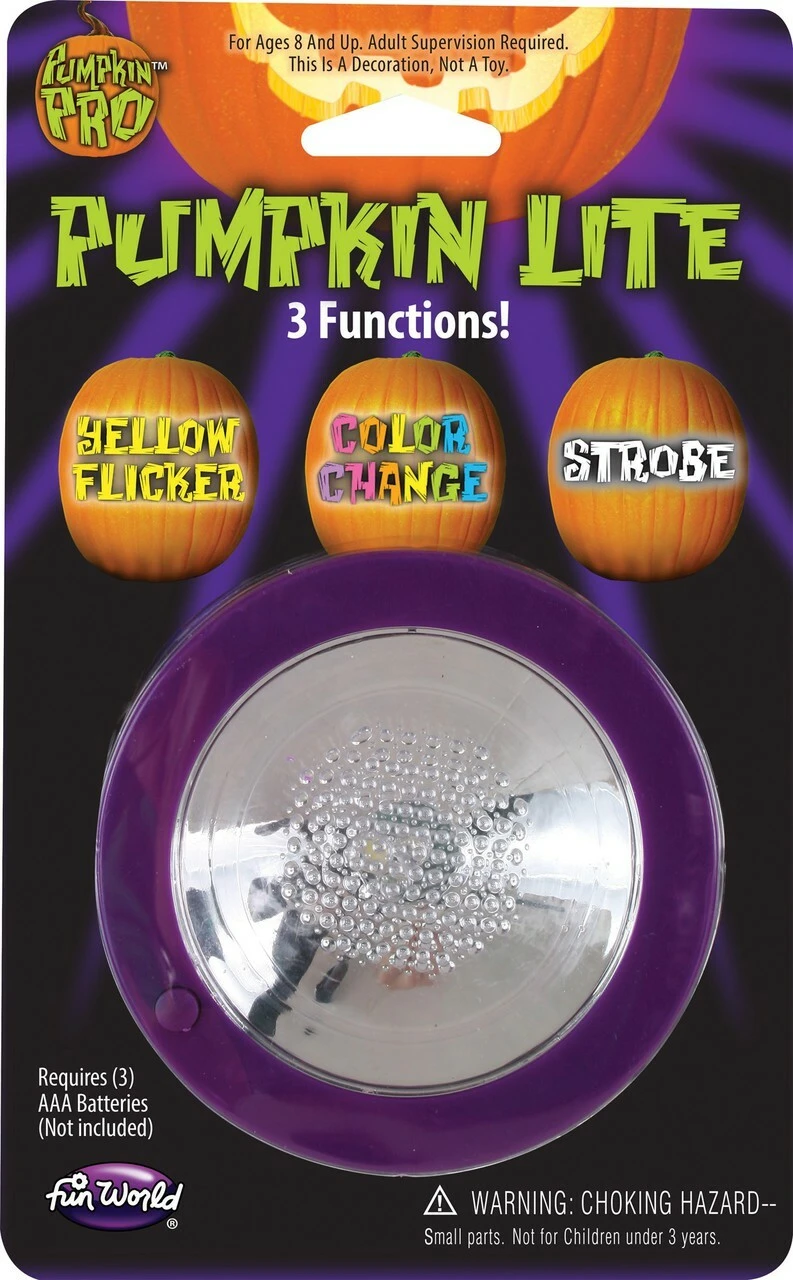 Nothing says Halloween like a good ol’ glowing pumpkin. Adopt this holiday staple with the 3-In-1 Pumpkin Light! Featuring the yellow flicker, color change and strobe effects, this light is a great way to create a safe and spooky lighting effect for your pumpkin! Requires (3) AAA Batteries (not included)