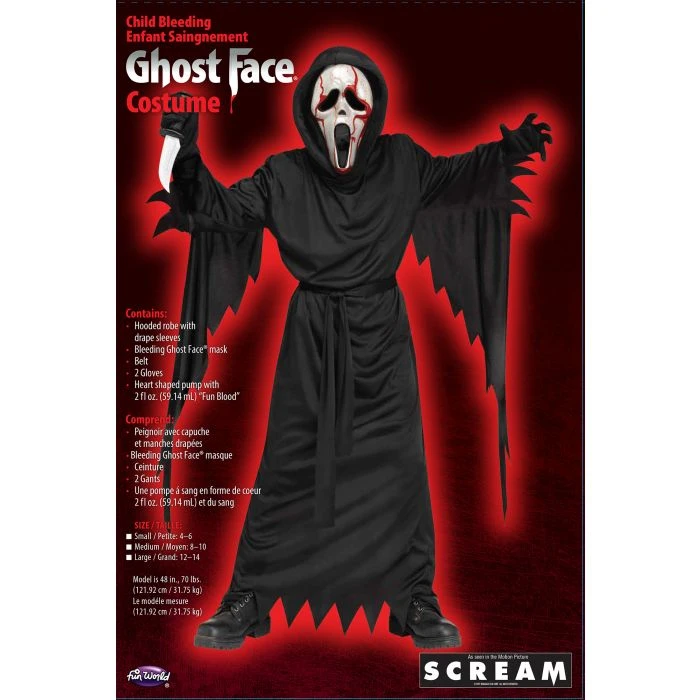 Hooded Robe with Drape Sleeve, Bleeding Ghost face Mask, Belt, 2 Gloves and heart shaped pump with 2Oz. of Fun blood.Â