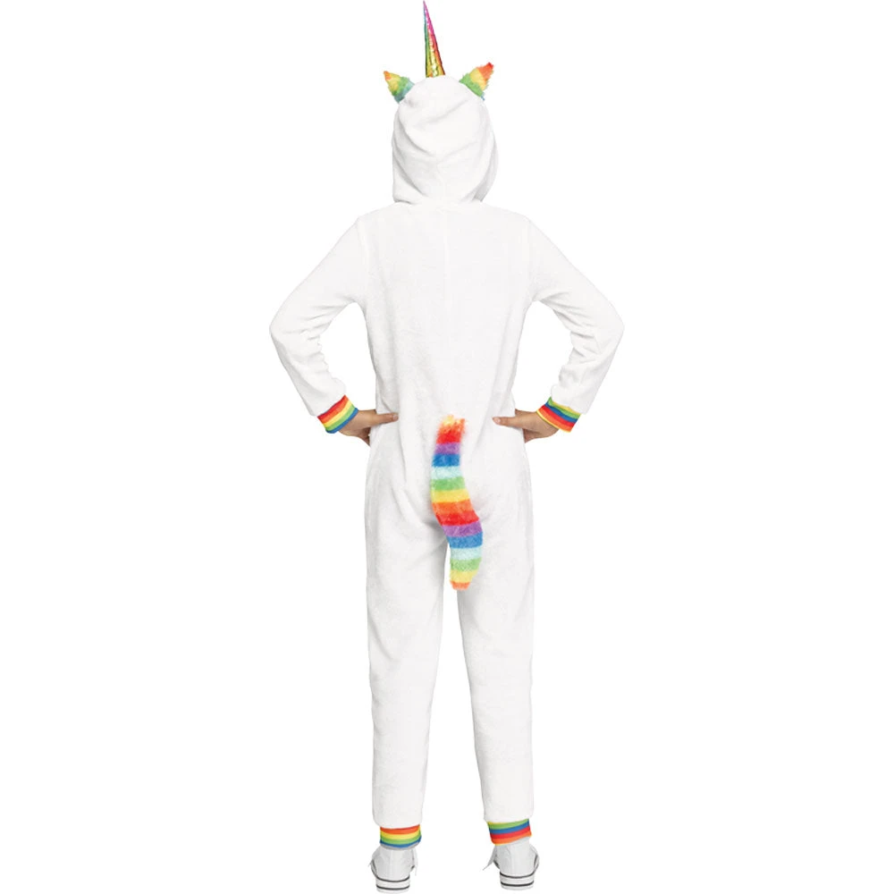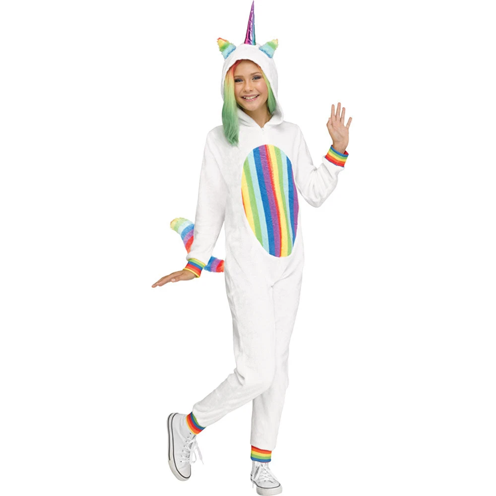 A Beautiful Rainbow of Color! Features soft white, hooded jumpsuit with zipper front opening, rainbow stripe tummy, ankle and wrist cuffs, attached ears and detachable tail. Also includes shimmering iridescent attached unicorn horn.