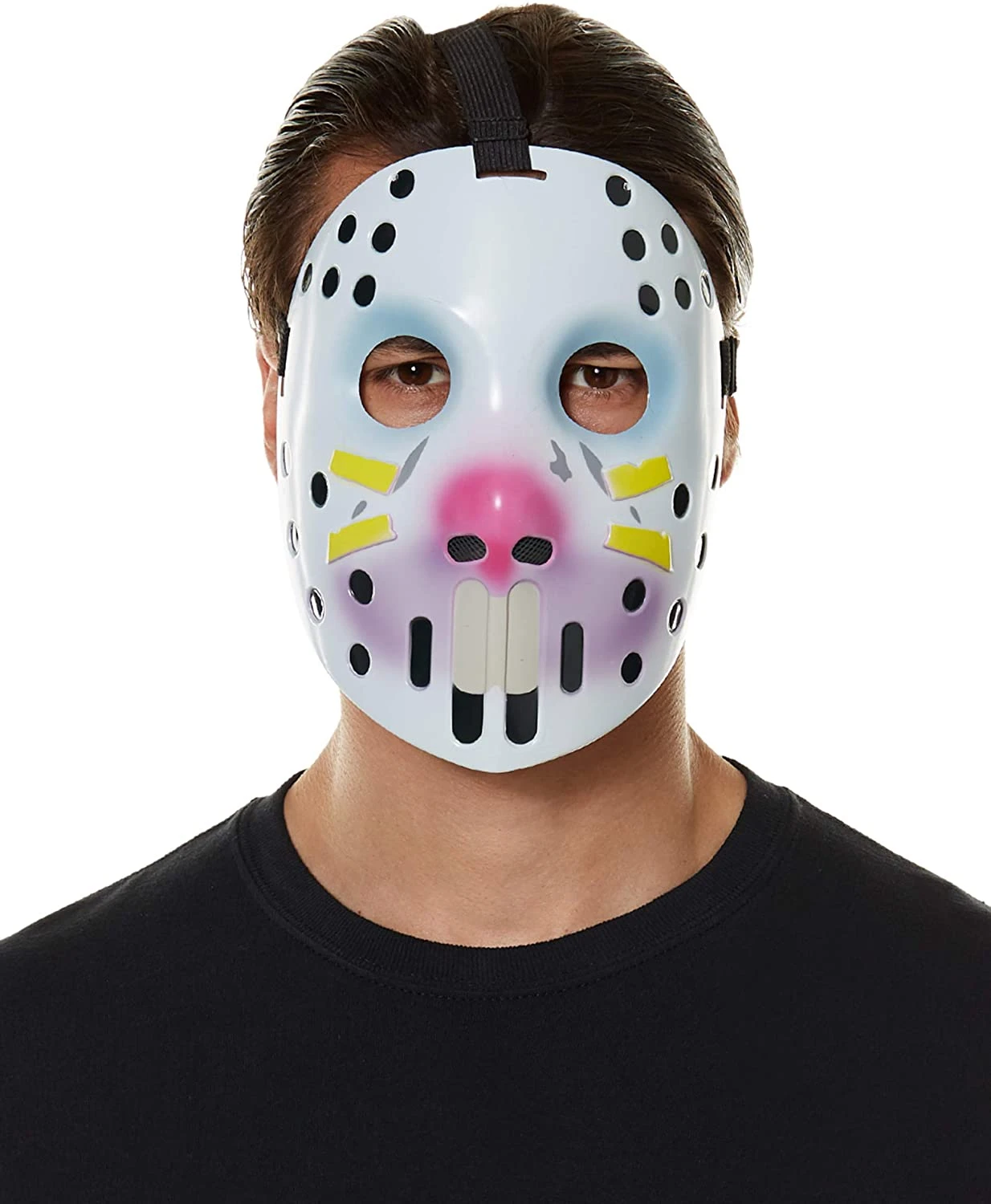 Hippity hop your way into everyoneβs nightmares this Halloween when you wear this official Rabbit Raider Mask. This white hockey-like mask is designed with bunny features and has an elastic strap so you can hop all over without it falling off. No one will want to mess with this bad bunny on Halloween!