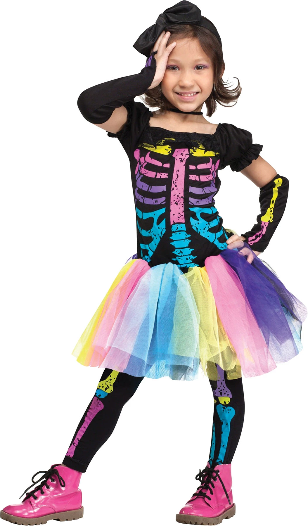 One of the cutest and colorful skeleton costumes ever! Includes neon rainbow dress, sleevelets and footless tights. Shoes not included.