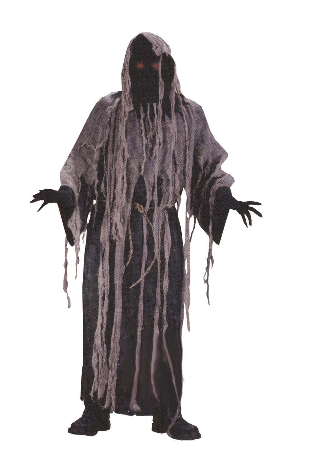 Perfect scary costume for your next haunted gathering! Hooded mask with light-up fading eye mechanism tops a, robe with a gauzy, tattered collar and comes with a rotted-look gauze over-robe, black gloves, and belt. Glasses require 3 AA batteries, not included. One size fits 33-45.
