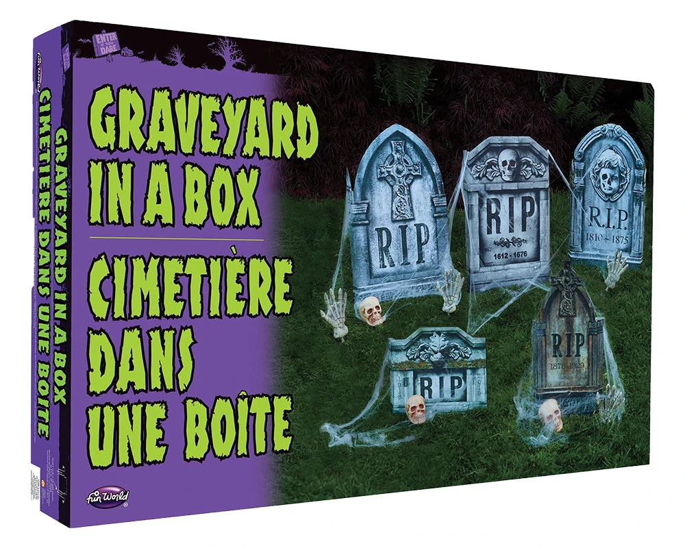 Everything you need for creating your own spooky Graveyard Scene is included! You will get 3 large and 2 small Tombstones, 3 Skulls, Spider Webs, Spiders, 4 Skeleton Hands, plus 14 stakes to use for the hands and skulls. All comes in a full color Display Box!