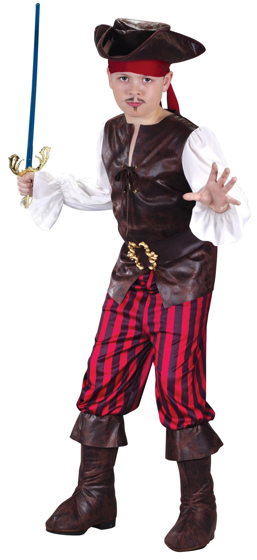 Peasant sleeve pirate shirt with attached vest, striped pants, belt, pirate hat, bandana and distressed leather-look boot tops. Sword not included. Polyester.