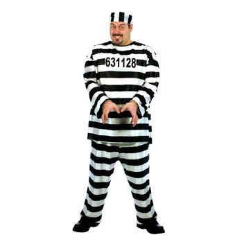 Jailbird costume includes a white and black stripe top with convict numbers, pants and matching hat. Handcuffs sold separately.