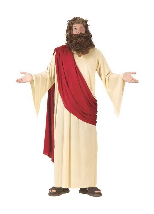 Carpentry and walking on water, all in a day’s work! The Jesus costume includes a full cut robe with attached maroon drape, soft crown of thorns, beard and wig.