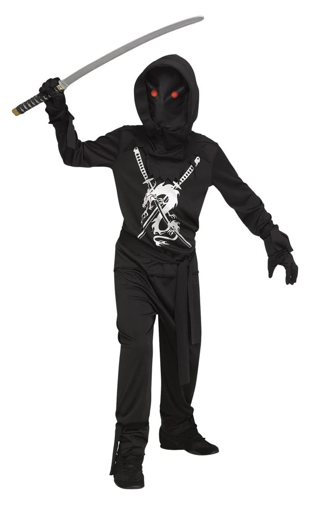 Everyone knows little kids are pretty much 99% ninja anyway, so this costume is the perfect choice for your child! Black hood, shirt, pants, belt, 2 leg ties, 2 arm ties, fade in/out glasses mechanism, and battery pack which requires 3 ‘AA’ batteries (not included).