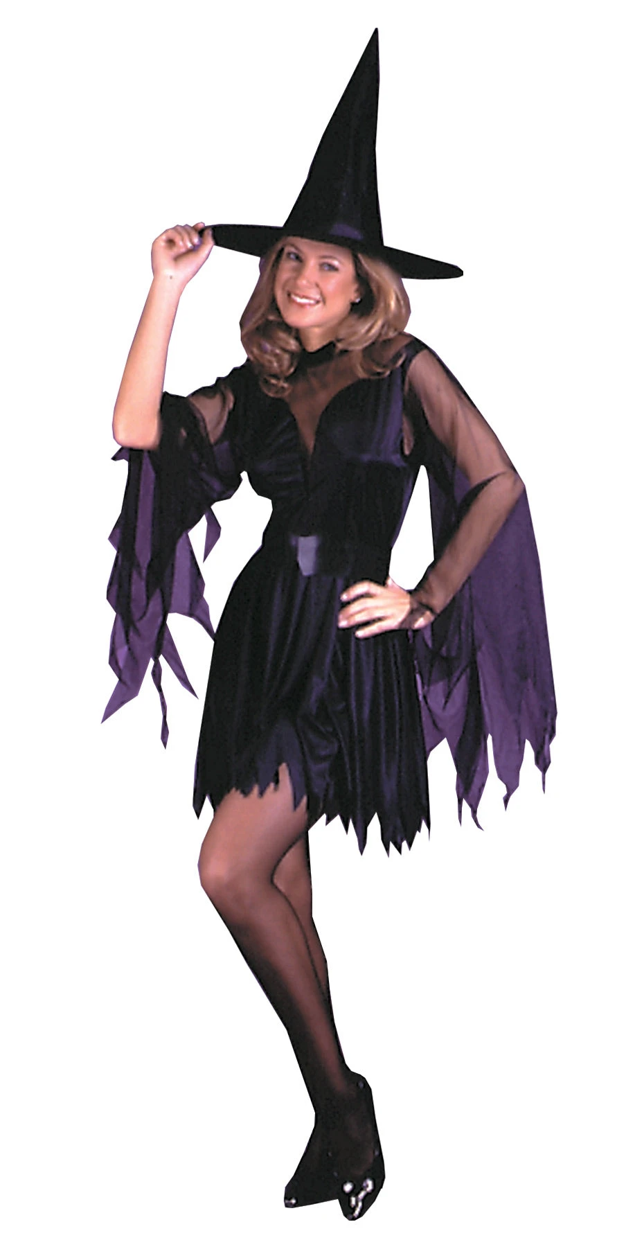 Zig-zag trim dress with cutaway mesh neckline and mesh flared sleeves, velveteen colar, witch hat, and leatherette tie sash. Fits up to size 12-14. Polyester.