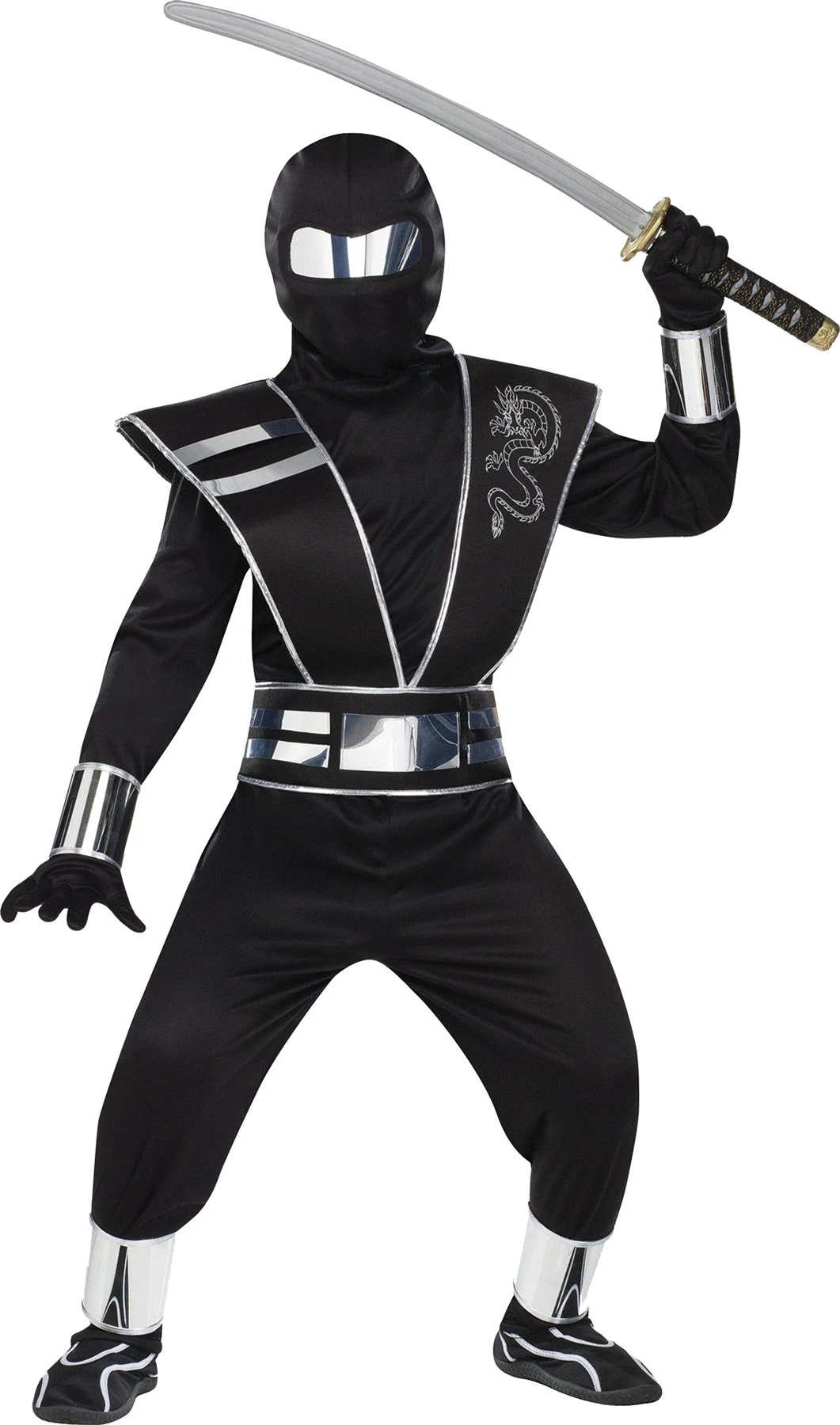Distinctive and original ninja costume concept that allows wearer to see out but no one can see face of the wearer. Top, pants, tunic with belt, ankle & wrist guards, and hood with mirror mask. Sword not included.
